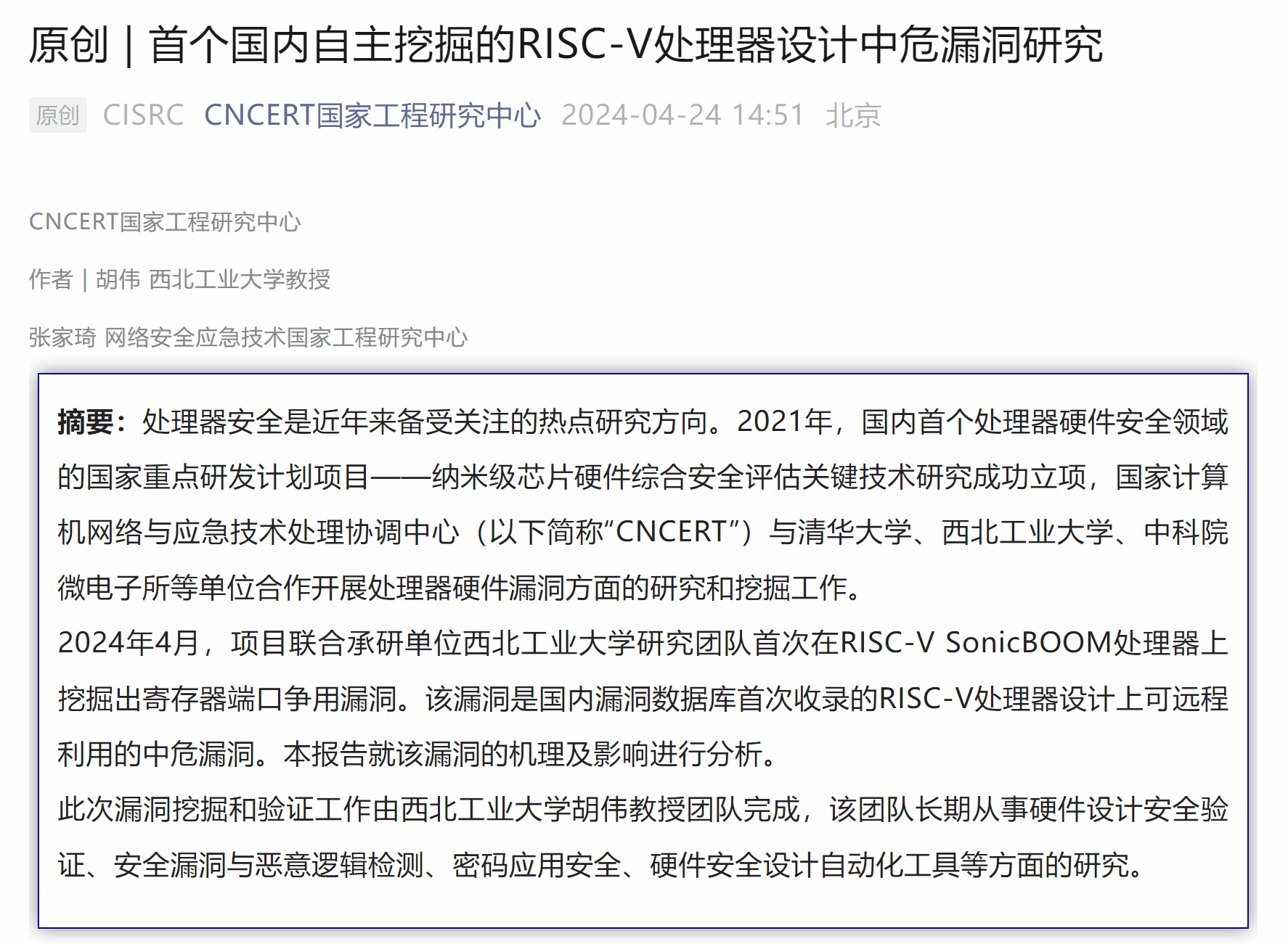 近年来,处理器安全成为国内外网络空间安全研究的热点方向。这次在RISC-V SonicBOOM处理器上挖掘出寄存器端口争用漏洞在漏洞危害程度、评分值和可利用性上均超过已收录的同类漏洞。CNCERT国家工程研究中心对此漏洞研究情况进行了专题报道。