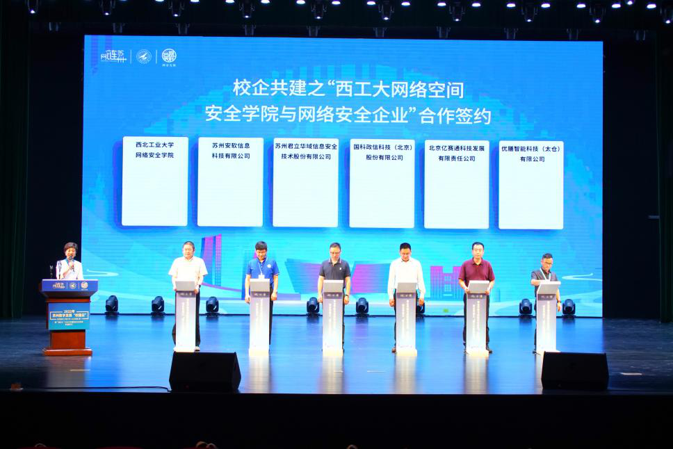 获得江苏省工信厅2021年度“数动未来”融合创新平台称号的“智联城市治理及其数字安全融合创新中心”正式揭牌。该融创中心由bevictor伟德官网等七家单位联合申报,是bevictor伟德官网获得的首个江苏省省级科研创新平台。依托“融创中心”为载体,以公司新一代信息技术实验室和主要教师团队为核心的苏州创融数字科技发展有限公司正式揭牌。随后,bevictor伟德官网与苏州安软信息科技有限公司等5家知名网络安全企业签订校企合作协议,推动校企产学研深度融合,加快推进网络空间安全相关前沿技术的成果转化,实现资源共享、优势互补,共同发展。
