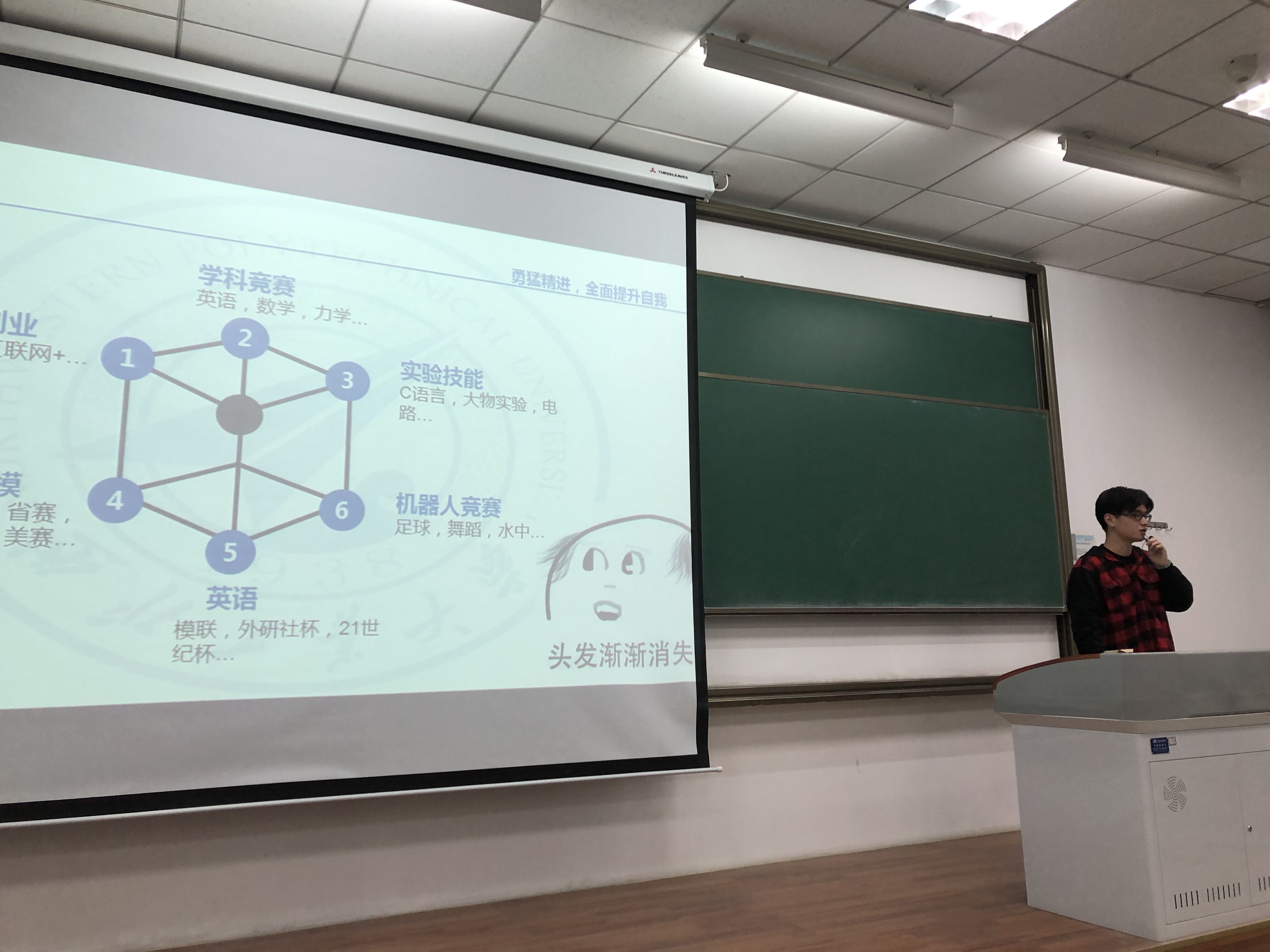 分享会的开始,2016级的石卓扬同学根据他的经验,为19级同学总结了参与度比较高的竞赛,主要包括创新创业类,例如挑战杯,互联网+等;学科竞赛类,例如高数竞赛,力学竞赛,英语竞赛等;实验技能类,例如C语言,大物实验等;数模竞赛,包括5月份的校赛,9月份的国赛以及2月份的美赛等;英语类,例如模联,外研社杯等;以及机器人竞赛,包括足球机器人,舞蹈机器人等。此外在科研方面,石卓扬同学建议大家可以通过自己联系老师、高峰体验计划和通过竞赛等方式参与科研,产出论文专利等。