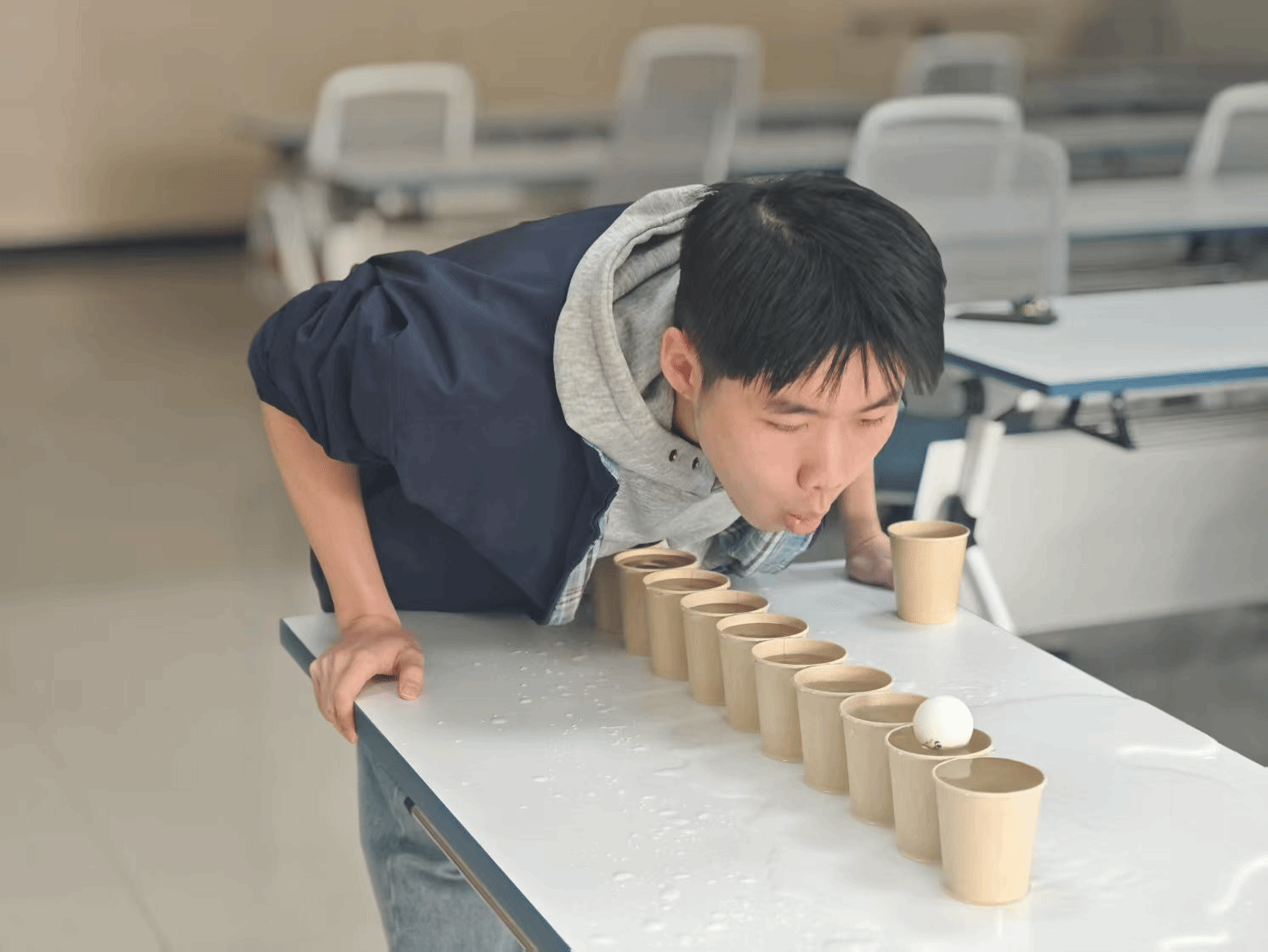 上午11时,本届院运会的乒乓球吹球接力赛在网安公司楼101举行。这项赛事中,运动员需要使用吹气方式使乒乓球依次通过5个盛水纸杯(间距50厘米),掉落需放回重试,计时最短者胜。运动员屏息俯首,用呼吸操控着乒乓球在湿滑杯沿间跃进,飞溅的水珠与倒计时器上的数字同步震颤。最终,徐瑞同学荣获冠军,黄远鑫同学荣获亚军,张恩玮同学荣获季军。