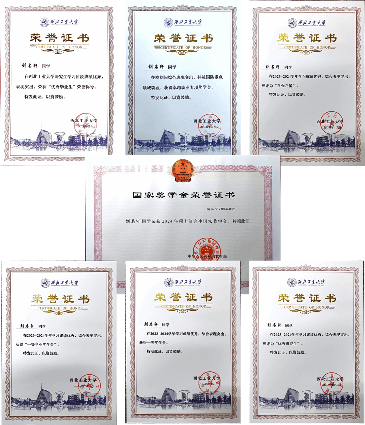 刘名轩连续两年获得“优秀研究生”荣誉称号,并获得“自强之星”、“优秀毕业生”荣誉称号。荣获2024年研究生国家奖学金,伟德官网bv1946一等学业奖学金以及卓越就业专项奖学金等。
