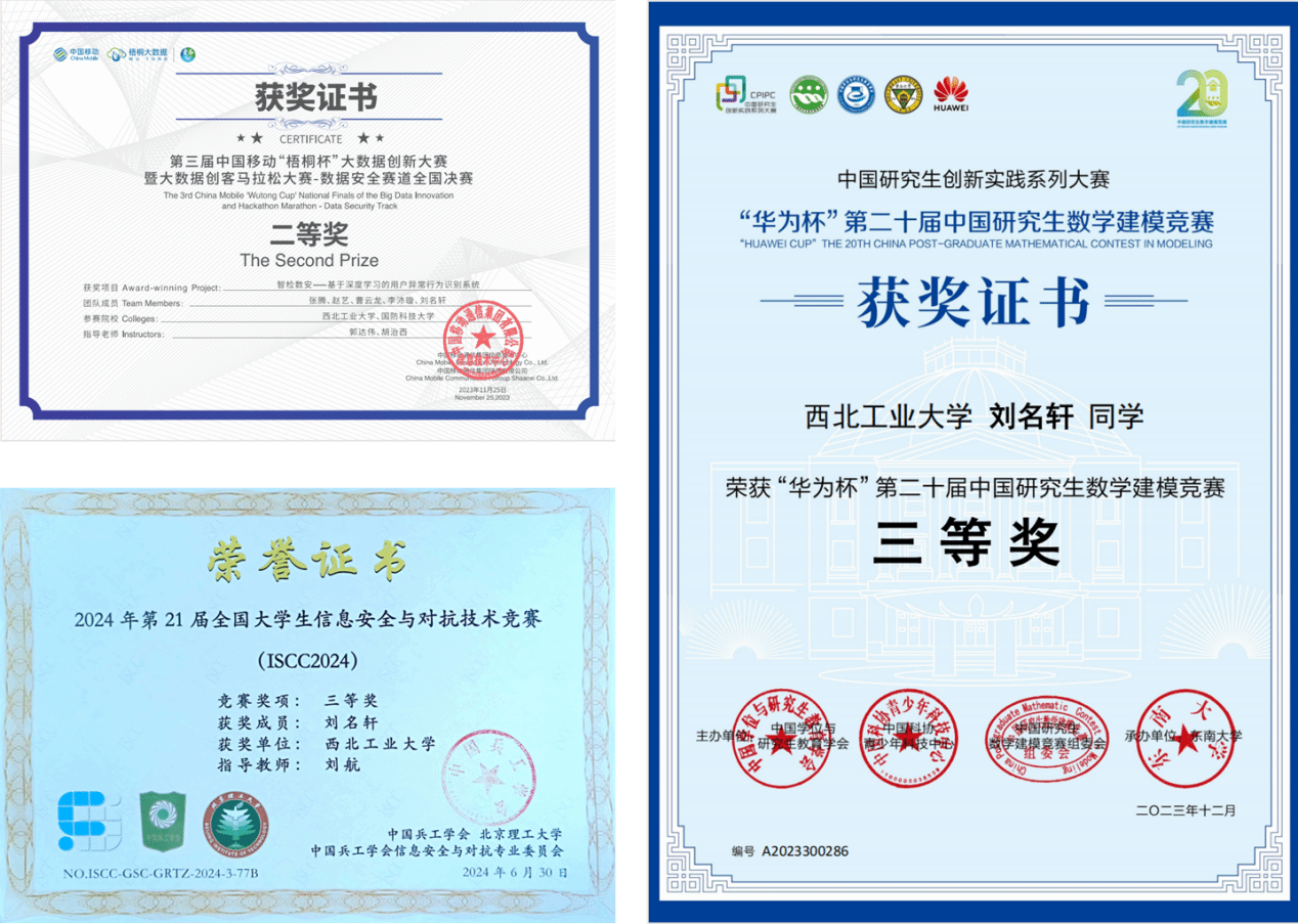 研究生期间参加各类国家级比赛,获得中国研究生数学建模比赛三等奖,中国信息安全与对抗技术竞赛个人赛三等奖,中国移动“梧桐杯”数据安全赛道全国决赛二等奖等众多国家级比赛奖项。发现并成功提交 5 个高危 CVE 漏洞,为网络安全漏洞库建设与防护技术优化提供关键支撑,切实提升网络空间安全防御能力。