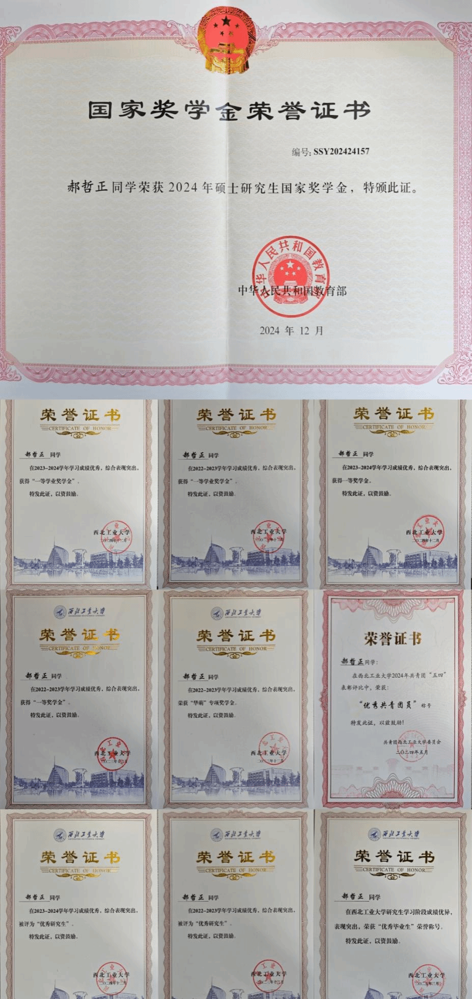 曾多次获得国家奖学金、华萌奖学金、校一等奖学金、学业一等奖学金、校优秀研究生以及优秀共青团员等荣誉。