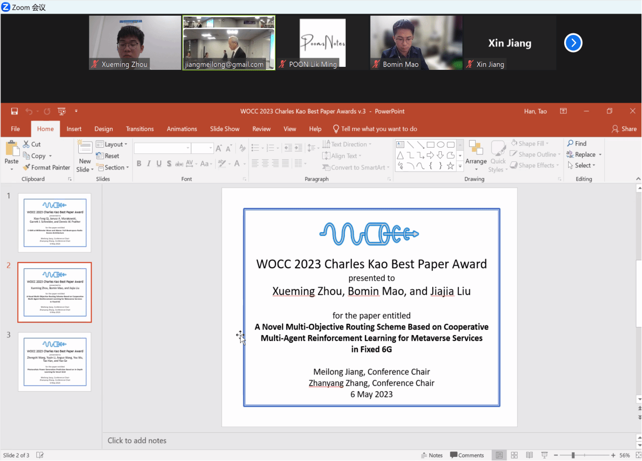 [5] Zhou Xueming, Mao Bomin, Liu Jiajia. A Novel Multi-Objective Routing Scheme based on Cooperative Multi-Agent Reinforcement Learning for Metaverse Services in Fixed 6G[C]//2023 32nd Wireless and Optical Communications Conference (WOCC). Newark, NJ, USA, IEEE, 2023: 1-5.(最佳论文奖)