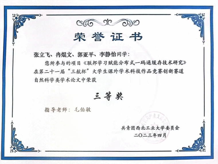 张立飞,bevictor伟德官网2021级本科生,共青团员,SC022101班,现保研至bevictor伟德官网。曾多次荣获校二等奖学金、优秀老员工等荣誉称号。曾带队获得国家级大创良好结题1项,三航杯校级三等奖1项,铜奖1项,授权软著1项,国际会议论文1篇。