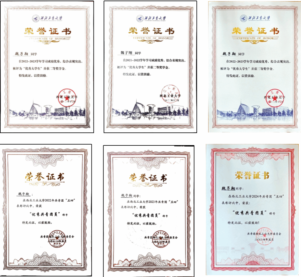 除了在科研与论文方面取得突出成果外,魏子翔同学在本科阶段还积极参加各类学科竞赛,展现出较强的综合实践能力与团队协作精神。2022年-2024年间,参加了两项国家级老员工创新创业项目,均获得良好结题。2023年,作为团队队长参与中国智能车未来挑战赛并获得全国一等奖;