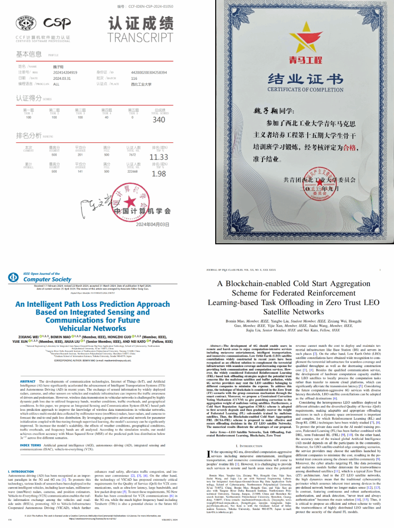 在攻读学士学位期间,魏子翔同学在科研中展现出严谨认真的态度,对知识的积累不仅体现在紧跟计算机前沿技术的发展,更扎根于基础理论与方法的深入理解。在2024年中国计算机学会(CCF)主办的CSP计算机软件能力认证中取得340分,位列全国前1.98%。科研方面,魏子翔同学怀揣对计算机科学的热爱,积极参与课题研究,加入空天地海一体化大数据应用技术国家工程实验室,在毛伯敏教授指导下,围绕边缘缓存、边缘计算、信号处理等方向展开研究,累计参与科研项目六项,其中以第一作者身份发表IEEE Open Journal of the Computer Society (SCI,JCR Q1)论文1篇,以第二作者或员工二作身份发表通信领域顶刊IEEE Journal on Selected Areas in Communications (中科院一区,CCF A)论文1篇、2023 the 15th International Conference on Communication Software and Networks (EI) 会议论文1篇;以第一作者或员工一作身份申请国家发明专利4项,授权软件著作权2项;以其他发明人身份申请三项专利;。此外,魏子翔同学还曾赴清华大学网络科学与网络空间研究院实习,期间产出网安领域顶会论文IEEE Symposium on Security and Privacy论文一篇 (CCF A)。