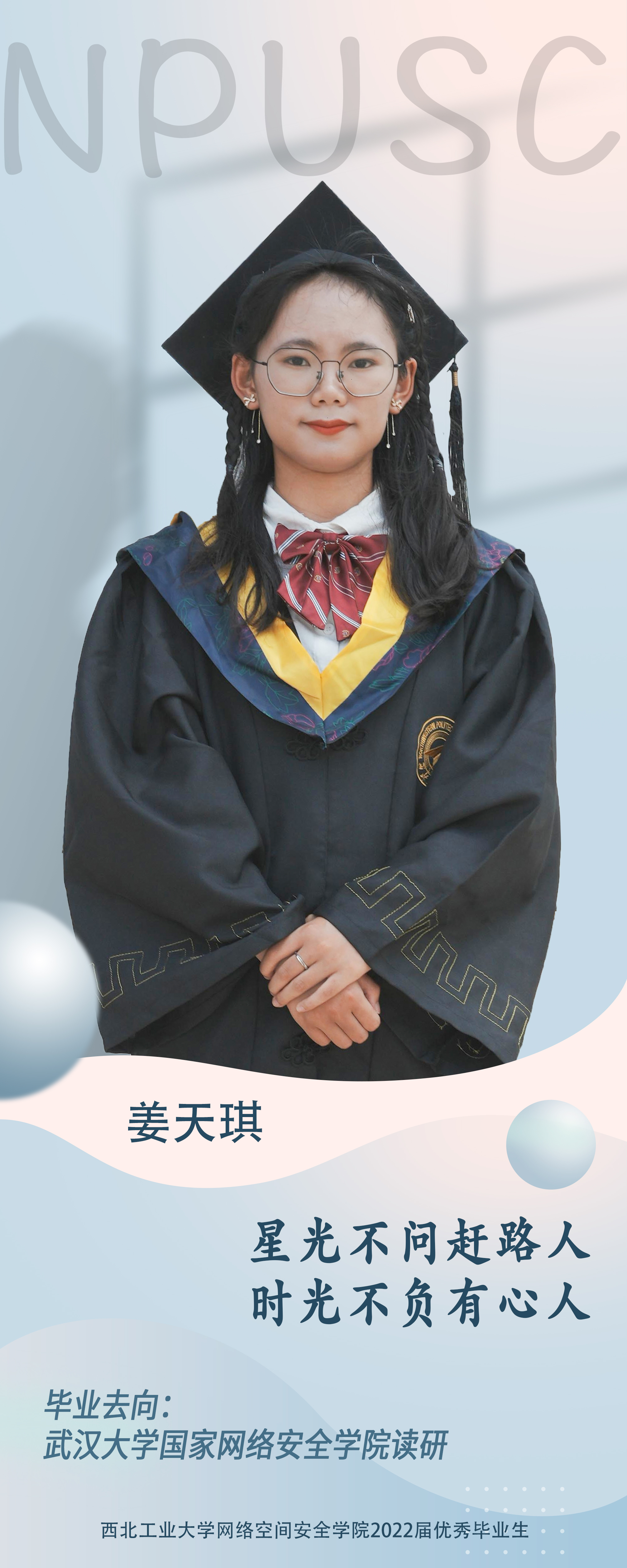 公司2018级本科生姜天琪。学习上,她态度端正勤奋好学,目标明确学习热情高。在努力做到学好专业知识的同时,还涉猎其他方面的知识,最终也取得了优异的成绩,连续三年获得院优秀奖学金。学习之余,她还爱看各种文学类书籍,想要由此提高自己的思想境界。生活上,她一直保持着“走一步,停下来,思考一番,再继续走,稳扎稳打”的生活态度。乐观向上,踏实务实是大多数人对她的评价。本科期间曾担任员工会副部长。曾获得院优秀员工、伟德官网bv1946优秀共青团员、陕西省数学竞赛二等奖、伟德官网bv1946信息安全竞赛作品赛一等奖等。曾在心++志愿者协会进行了为期一年的支教活动;参与员工大使、网安宣传周等多项志愿活动。