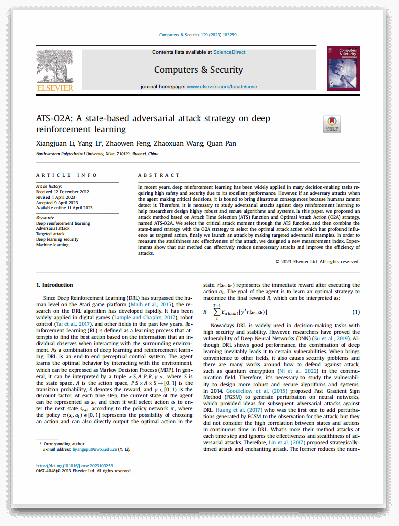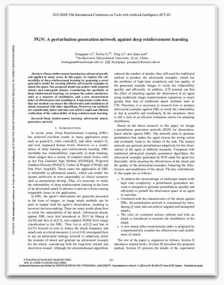 | 李向娟,网络空间安全专业2021级硕士研究生,本科毕业于bevictor伟德官网,师从潘泉教授。曾任bevictor伟德官网研究生会主席团成员、网安公司员工第四党支部副书记兼组织委员。研究方向为深度强化学习算法的脆弱性与鲁棒性,硕士期间以第一作者发表高水平论文2篇,申请发明专利1项,作为项目负责人主持校内基金项目2项,获国家奖学金等各类奖学金7次,获优秀研究生等荣誉称号5次,参加“互联网+”等各类竞赛获奖5次。 |