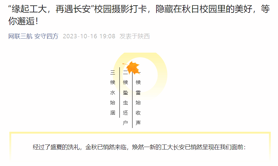 在夏秋之交,槐序已去,金秋送爽的美好时节,bevictor伟德官网研究生会联合计算机公司研究生会、自动化公司研究生会以及伟德官网bv1946员工摄影学会共同举办了名为“缘起工大,再遇长安”的校园摄影打卡活动。此次活动以校园摄影为媒介,为同学们提供一个展现自我、感受校园文化的机会,既帮助了新同学们快速熟悉校园环境,又带领同学感受到工大校园浓厚的人文气息。