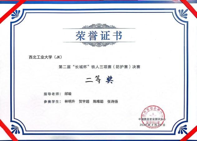 由bevictor伟德官网邰瑜老师指导的JK团队(成员:林明升、贺宇超、陈唯聪、张诗扬)也取得了优异成果,在本次“长城杯”铁人三项赛(防护赛)决赛中荣获二等奖,均刷新了公司在本赛事所取得的最好记录。