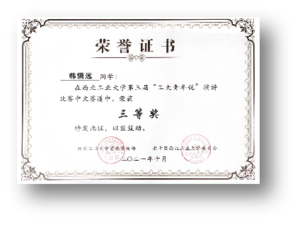 韩骥远同学积极参与社会实践,曾被评为“先进实践个人”。在丰富的校园活动中,他也斩获佳绩。
