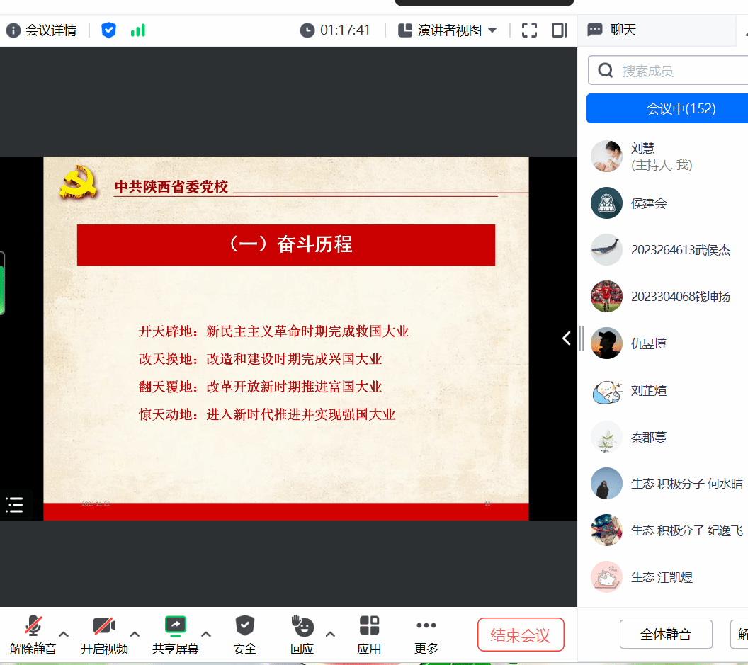 会议最后,公司组织员刘慧进行了总结发言。此次党课在满屏的对侯教授的感谢中落下帷幕,同学们纷纷表示,将以此次党课为契机,持续深入学习党的百年奋斗史和光辉历程,不断提升自己的政治素养,以实际行动彰显青年担当。